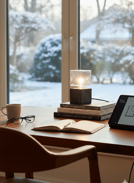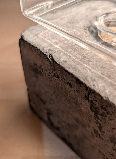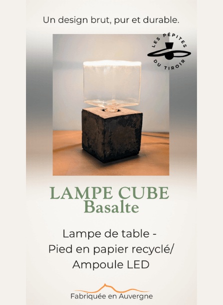 La lampe Cube Basalte se distingue par son pied cubique en papier recyclé, travaillé pour rappeler l’aspect brut de la pierre volcanique d’Auvergne. Chaque pièce présente de subtiles variations de texture, rendant chaque lampe unique.