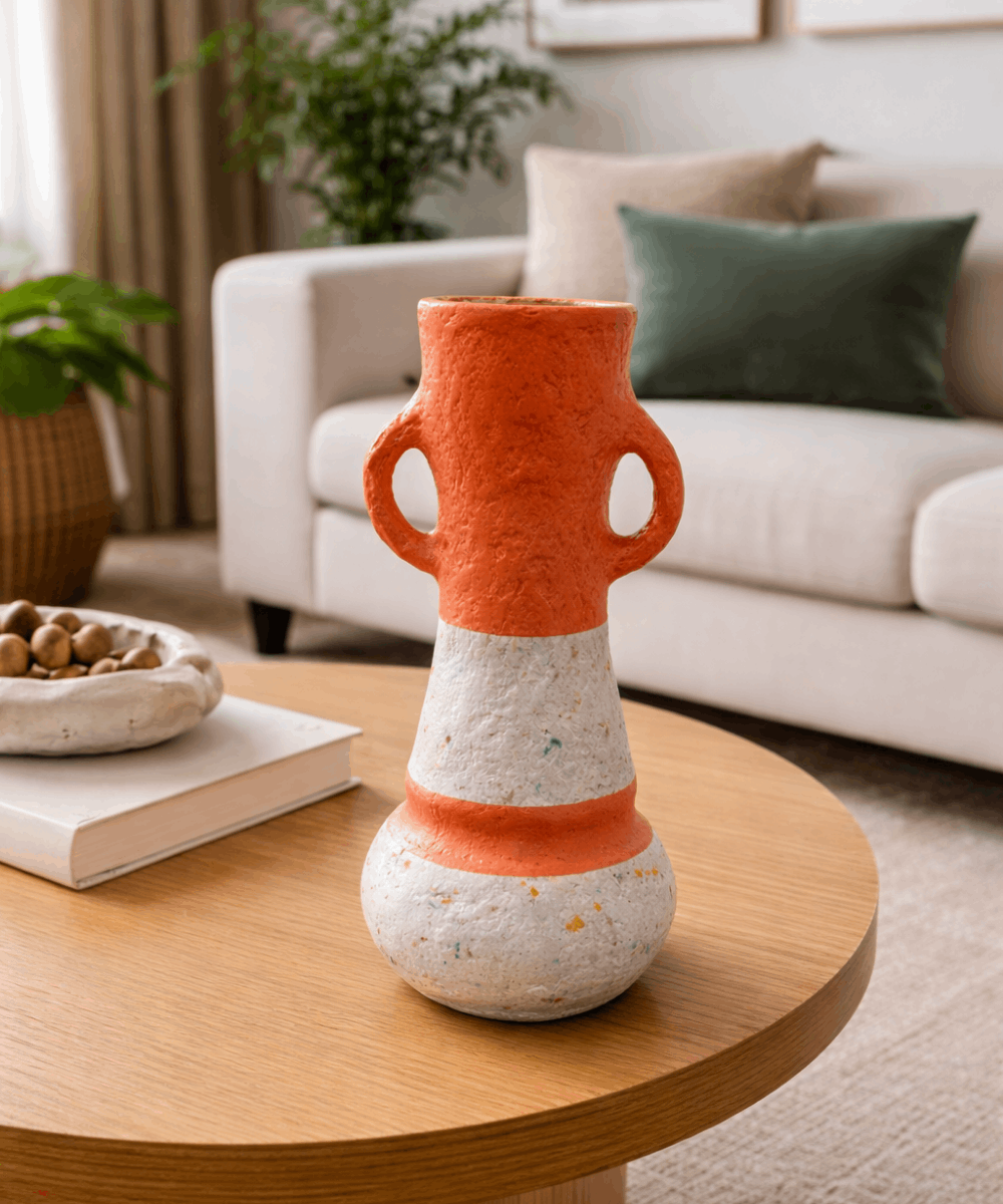Vase décoratif en papier recyclé, fabriqué artisanalement. Une pièce sculpturale et responsable pour sublimer votre intérieur.