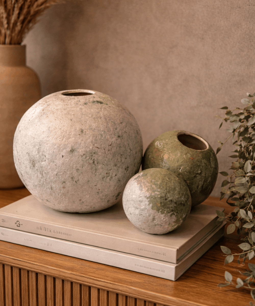 Leur forme sphérique douce et leurs nuances naturelles de blanc cassé et de vert évoquent la pierre, la terre et le végétal, tout en restant contemporaines. Chaque vase présente de subtiles irrégularités qui témoignent de notre travail artisanal.